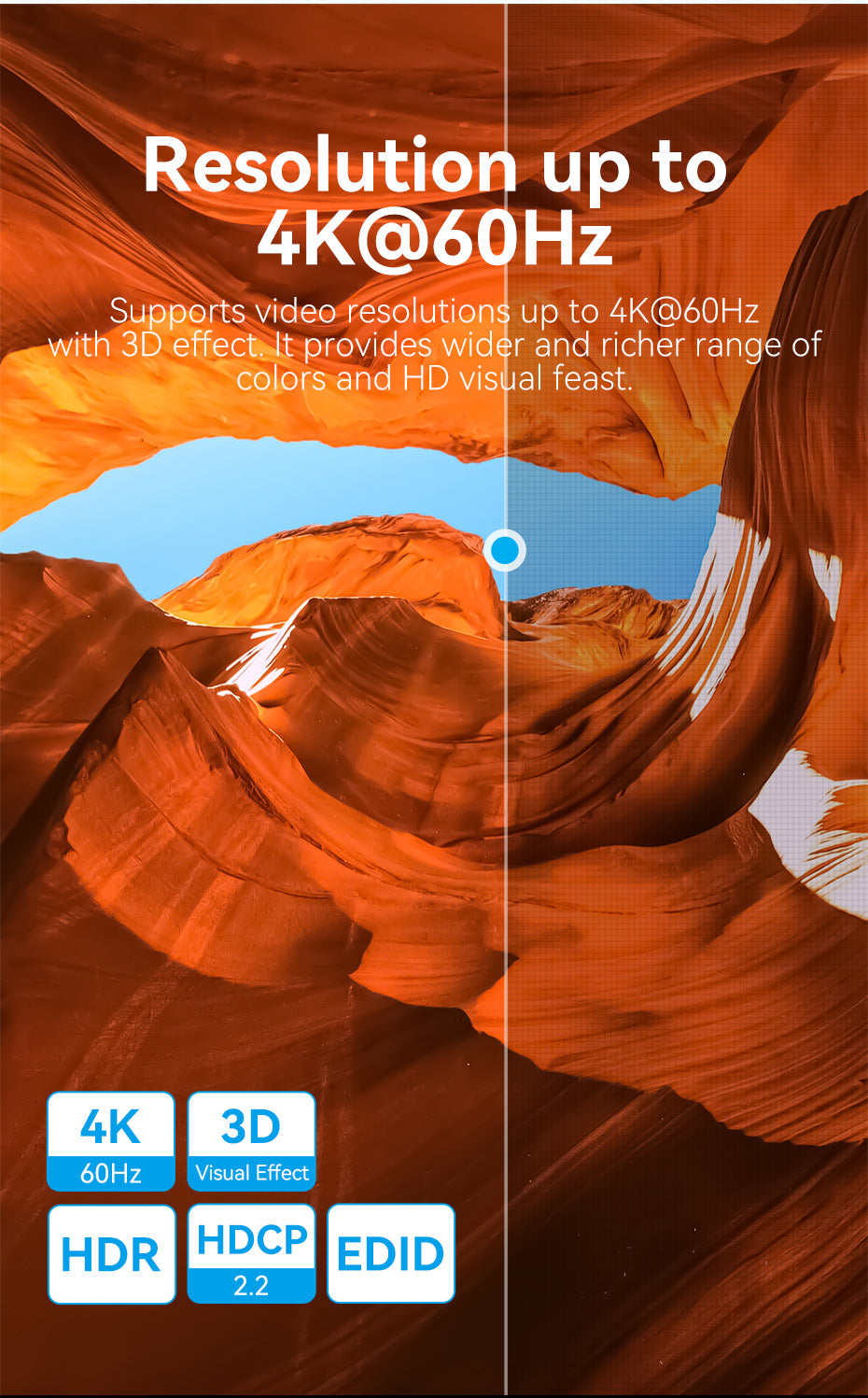 Supports video resolutions up to 4K@60Hzwith 3D effect. It provides wider and richer range ofcolors and HD visual feast.