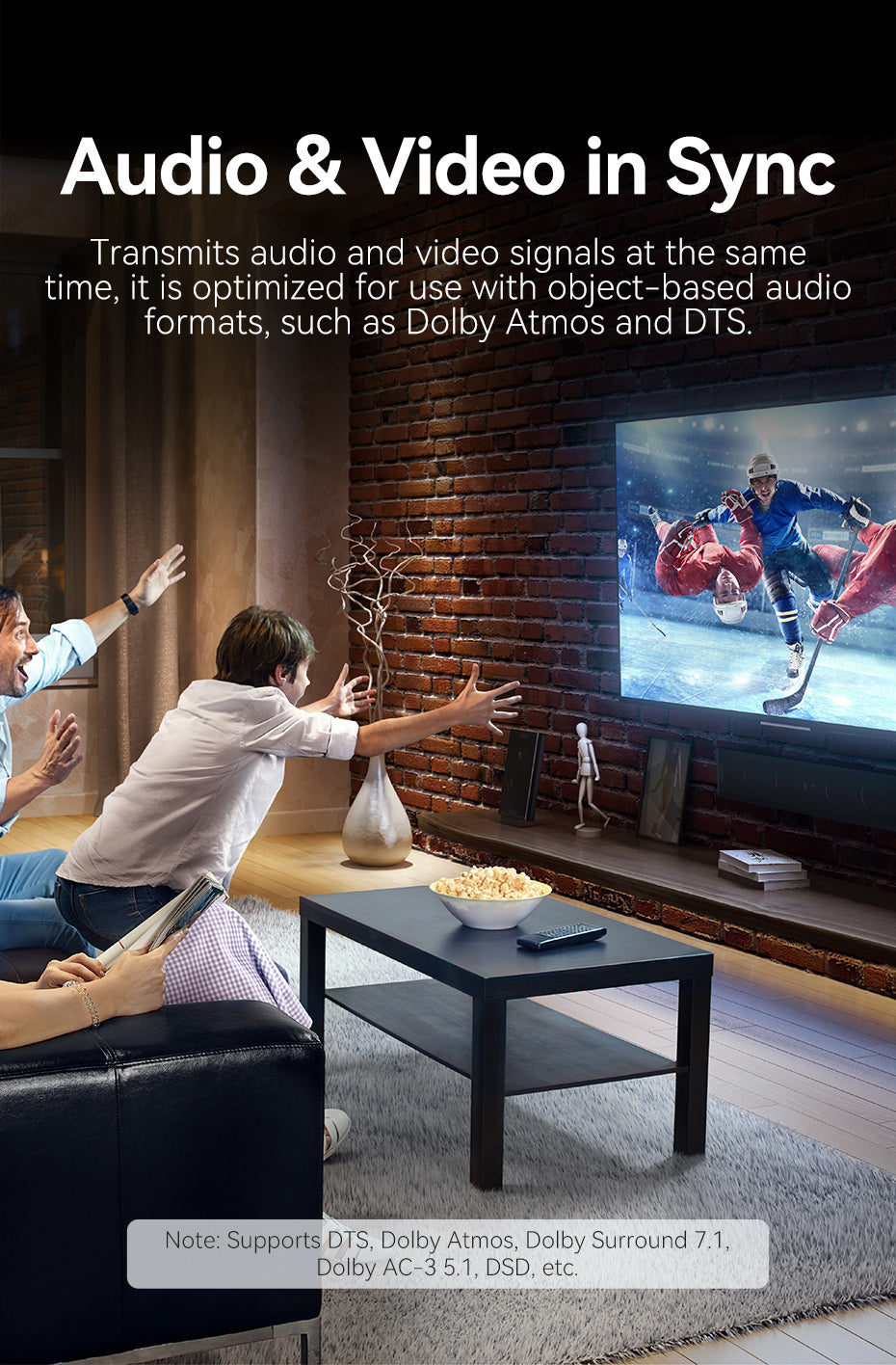 Transmits audio and video signals at the same time, it is optimized for use with object-based audio formats, such as Dolby Atmos and DTS.