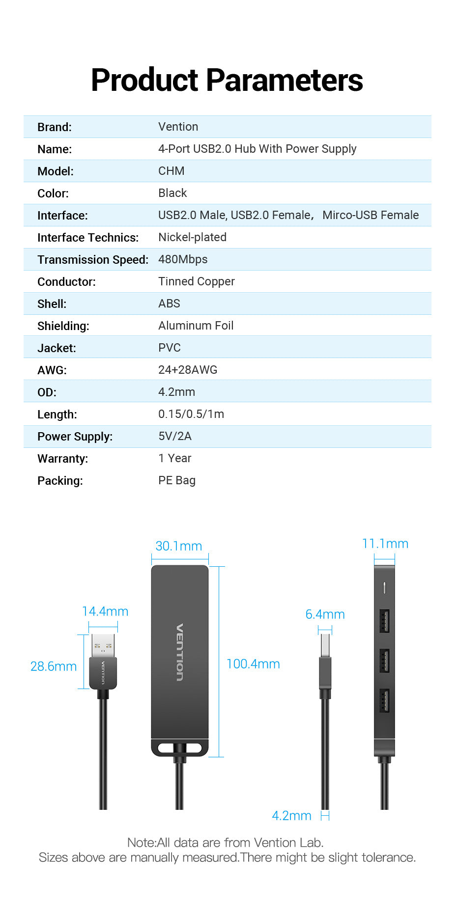 Vention 4-Port USB 2.0 Hub With Power Supply Black