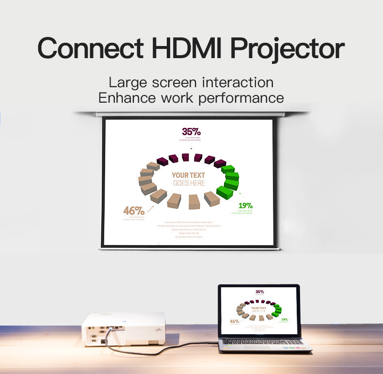 - Connects devices with DisplayPort output (e.g., desktops, laptops, graphics cards) to HDMI-enabled displays (e.g., TVs, monitors, projectors)