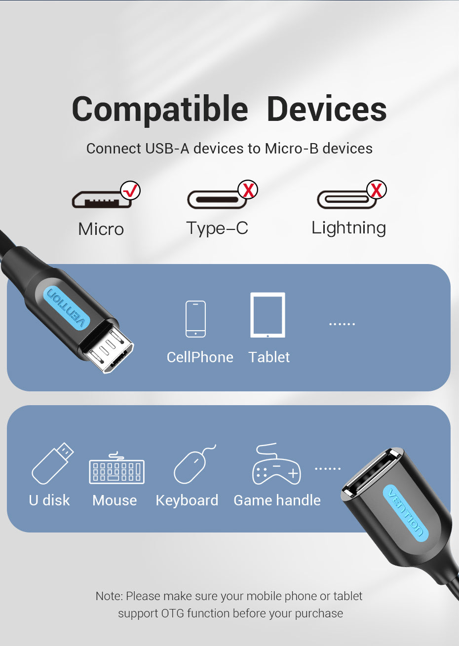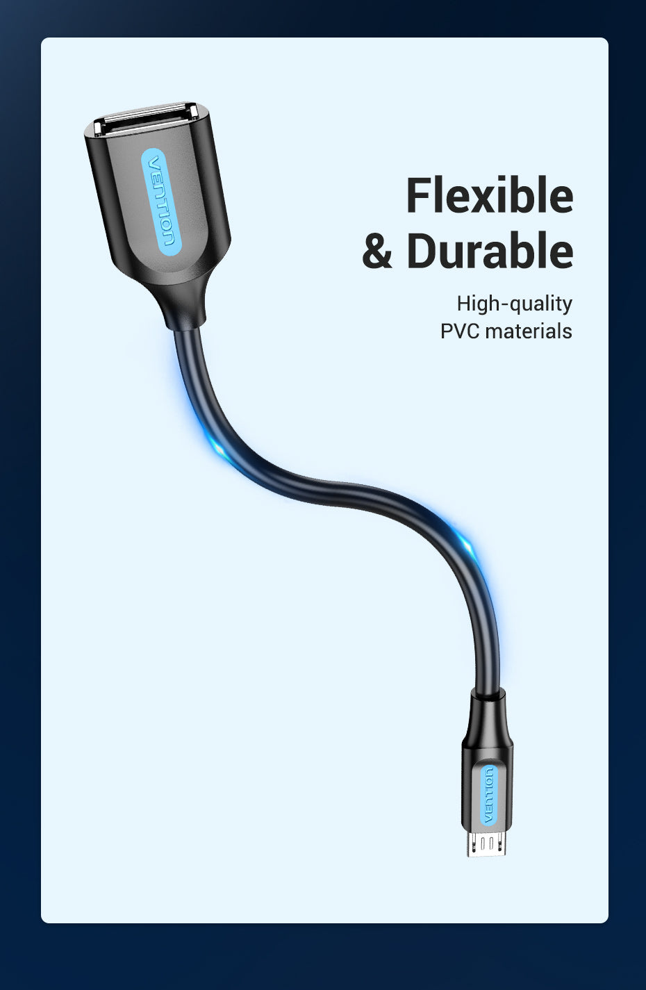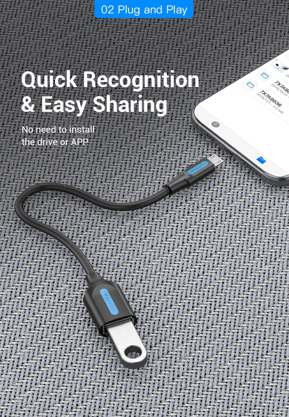 • Functionality: OTG (On-The-Go) functionality enables connection between a smartphone/tablet (with Micro-B port) and USB-A devices like flash drives, keyboards, mice, etc.