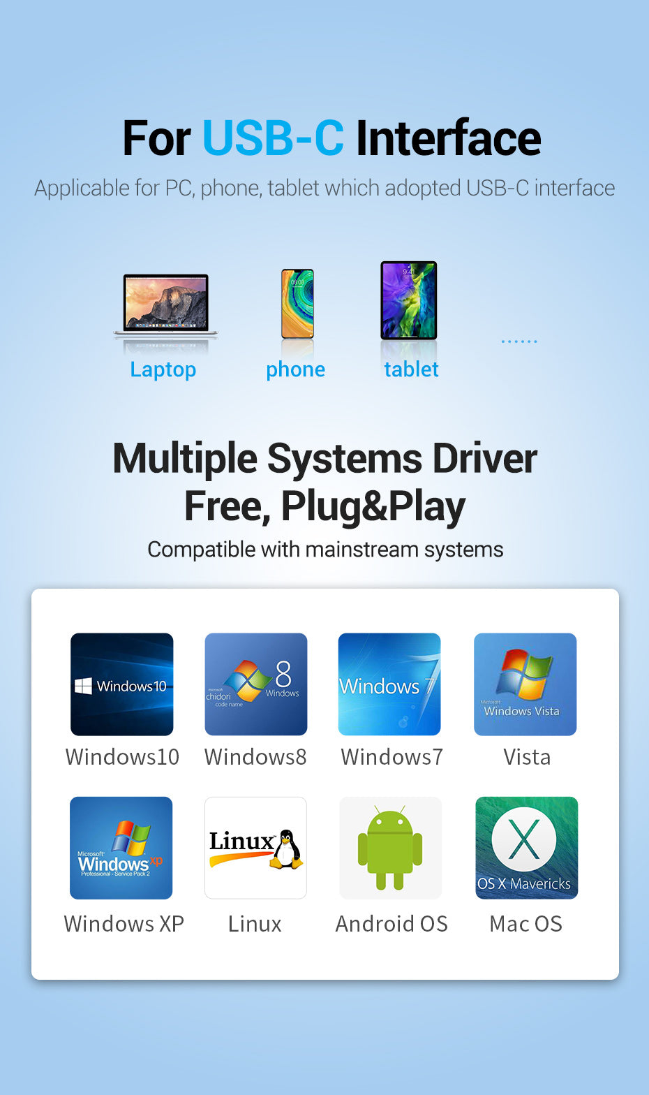 Applicable for PC, phone, tablet which adopted USB-C interface.