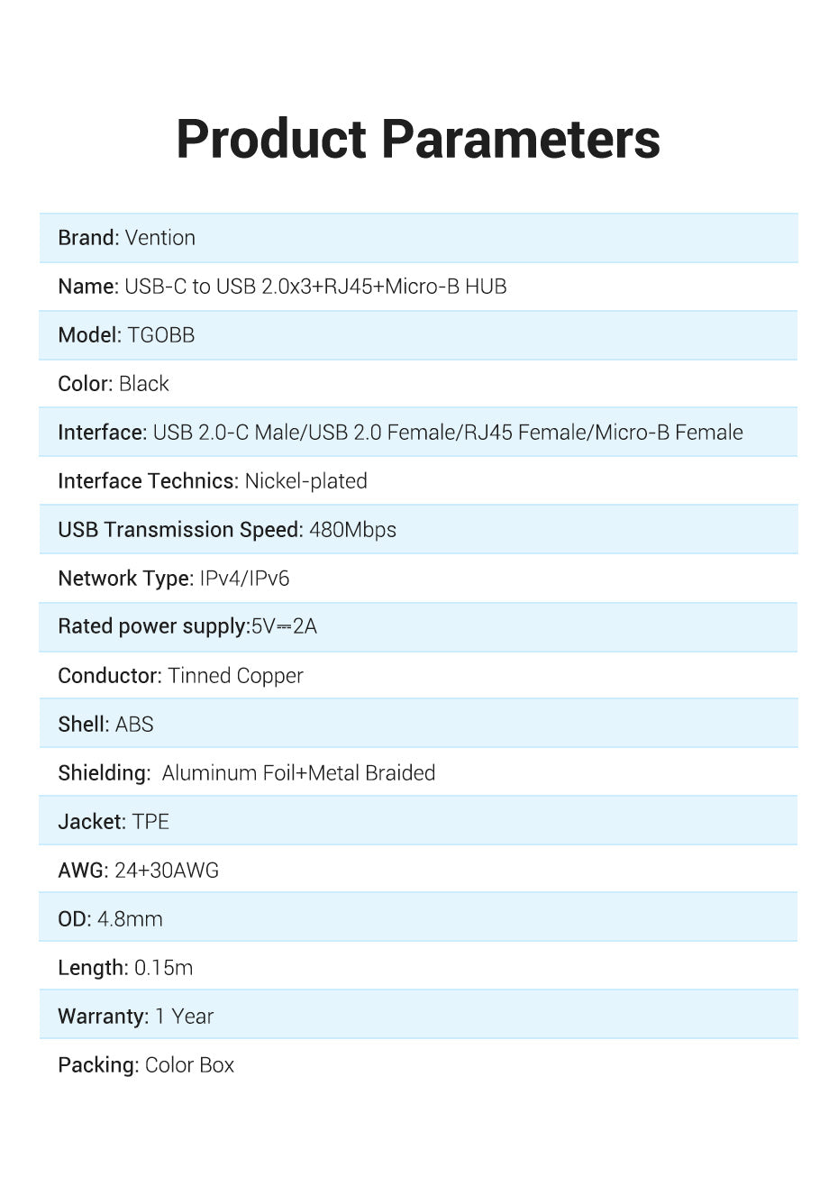 Interface: USB 2.0-C Male/USB 2.0 Female/RJ45 Female/Micro-B FemaleInterface Technics: Nickel-plated