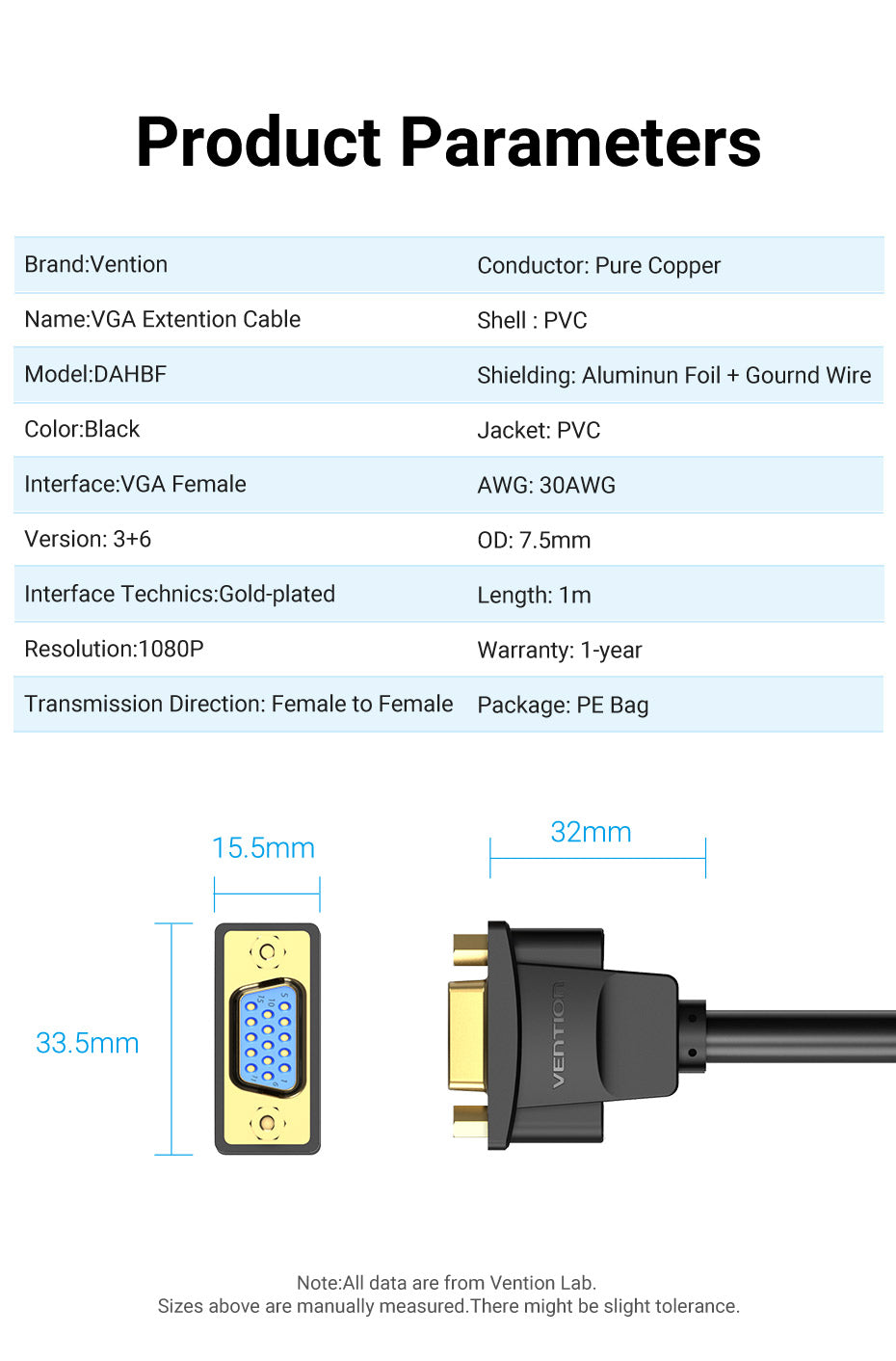 Vention VGA Female to Female Extension Cable, for Desktop Laptop TV TV box Monitor Projector